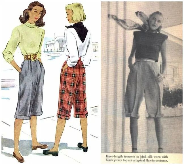 可以看一下Slim的度假穿搭:轻薄的半袖衬衫、棉质混纺阔腿长裤、绑带小坡跟凉鞋,还有象征着“胜利”的V式大卷。▲ 虽然资料里查不到Slim的具体身高,但根据丈夫的身高1.87m可以判断她绝对有1.75m上下了。这里就不得不歪一下楼说一下上世纪40年代的时尚潮流了。二战时期,虽然美国远离主战场,却由于需要把紧缺的物资全部用到前线,而对服装用料有着严格的限制,很多过去的款式被明令禁止,比如腰间下摆的褶皱设计被取消,连外套长度、裙围长短统统都有规定。