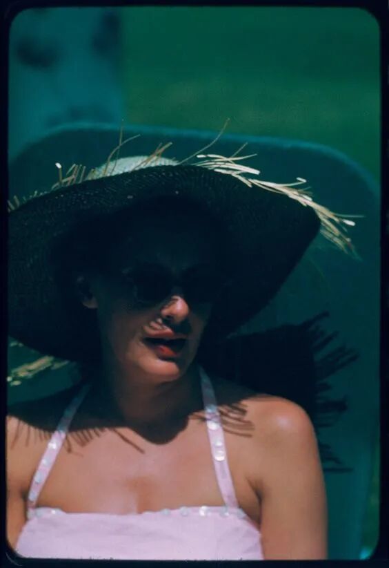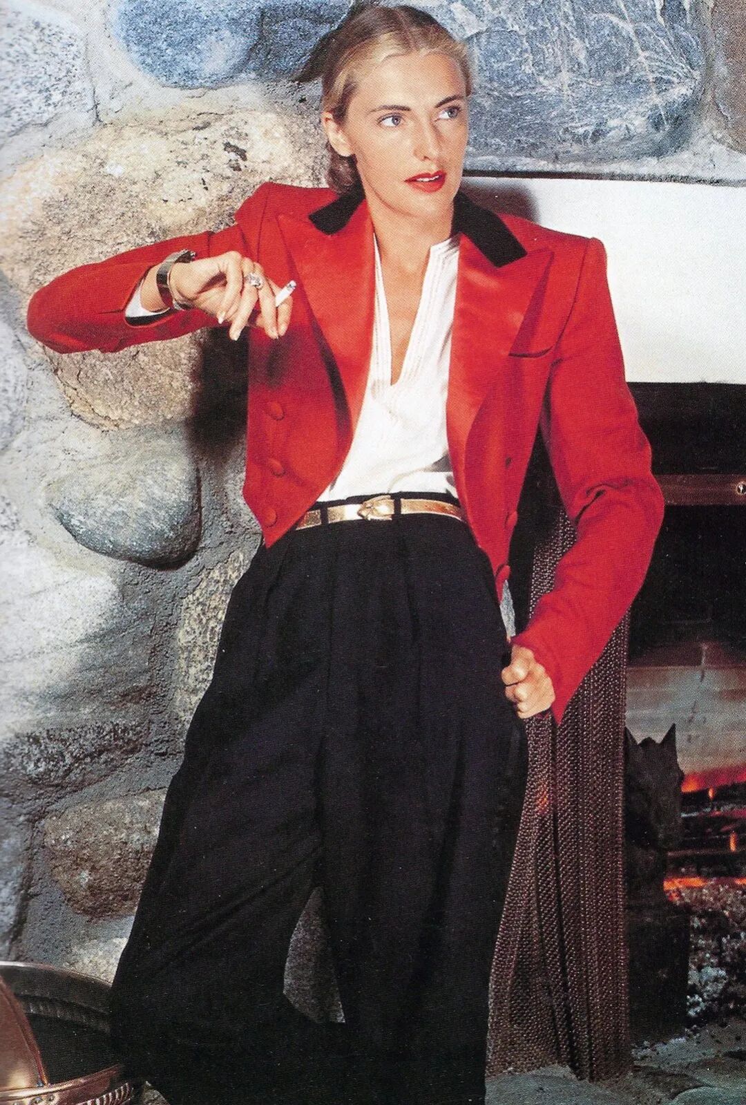 当时很流行这样的大卷发,被称作“victory rolls(胜利卷)”:▲ 是爱神Rita Hayworth的标志发型之一。她喜欢简洁干脆的线条,对她而言,时尚绝非随大流。作为外界口中最原始的“加州女孩”,她舍弃了最大众的荷叶边和大卷发,选择梳个小辫子:配上自己贴身的衬衫、西裤、夹克,打造了自己最经典的时尚造型:▲ 这张标志性照片,Slim手上拿着香烟,穿着白色深V内搭,红色军装夹克配黑色西裤,点睛之笔是金色腰带和古董手表配饰。她就这么静静倚着墙看着,又随性又潇洒。自由、野性又别致,被认为是Slim的时尚风格,也是她能在一众美人里得以脱颖而出的关键。▲ 她慵懒地躺在阳光里,手上的配饰夺人眼球,而这样花纹中裤,颇有Missoni的味道,露出了她完美的小腿线条。