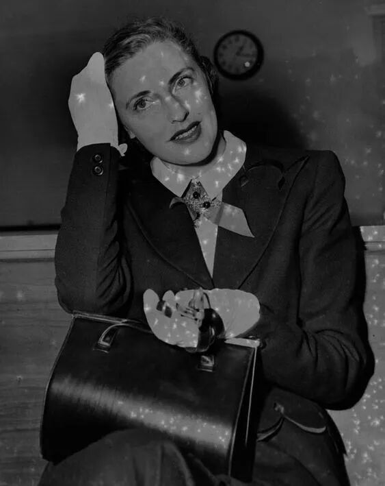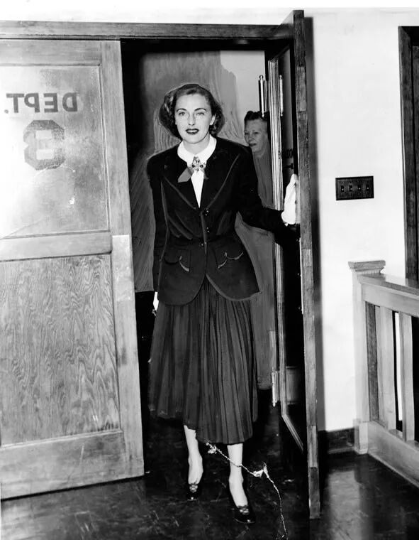 因为和海沃德的这段情,两人双双决定回去离婚,于是我们看到了1948年现身离婚法庭的Slim:▲ 这样的窄肩、细腰、西装下摆还有到小腿肚子的蓬蓬A字裙摆,正是1947年席卷全球的新风尚,来自Christian Dior的“Corolle(花冠)”系列。1947年,Dior用一场改变世界的发布会定义了之后15年的时尚风格:白色量身定制的外套,舍弃了传统的垫肩,加上黑色百褶裙摆,一改战时节省用料的理念,重新回溯古代宫廷时期的优雅风尚,令时尚芭莎的编辑Carmel Snow啧啧称赞: