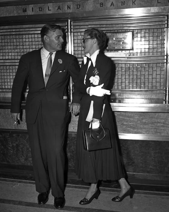 同样的,Slim的爱情世界里也并不只有海沃德一个追求者。▲ 比如Clark Gable(克拉克·盖博),这位出演了《乱世佳人》里白瑞德的知名男演员,也曾在1948年和Slim短暂约会过。▲ 以至于海沃德还曾因为盖博寄给她的明信片上写着“你真好”而吃醋。但正如她后来自己说的,海沃德才是她的一生所爱。1949年,他们完婚了。现场Slim的打扮十分简单,丝质长袖衬衫加上长裙,最多在脖子上加了条珍珠项链,藏不住嘴角的笑意盈盈: