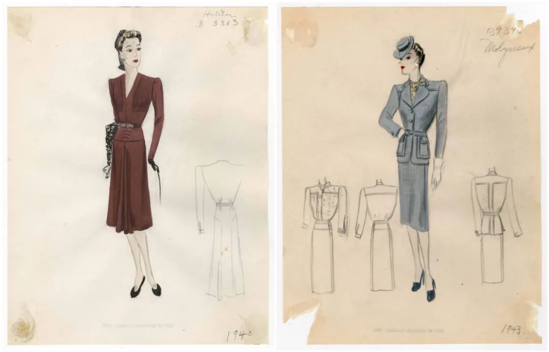 也是在那时,女性们开始利用手头仅有的资源创造时尚。比如拿男人的衣服来加工,靠着垫肩、收腰来凸显女性的身材曲线;或者是直接穿上制服、工装的改良款。▲ 这是那几年设计师们绘画的服装手稿,偏好用蓝色和红色,因为这正是美国的国旗衍生色,是爱国主义时尚的表现。▲ 而垫肩、细腰、条纹长裙都是那时的风尚,Slim也穿过(图右)。
