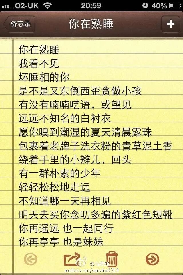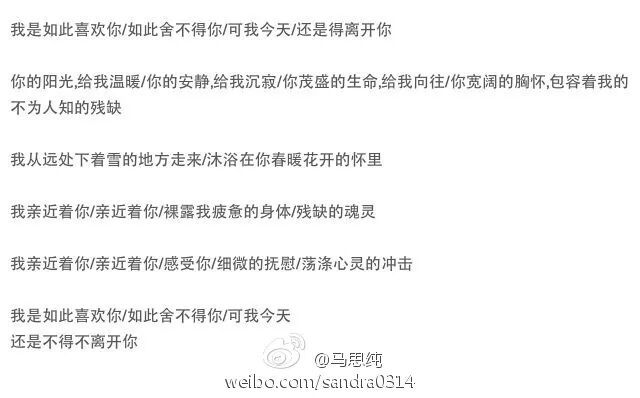 一出场还整个金马影后,多少女演员演了一辈子都得不到的奖项马思纯一出马就得了,但就是这样完美的身世,马思纯的自我却呈现出一种松散、脆弱的形态,她又敏感、又自卑、又阴郁,早年间特别喜欢在微博上诉说自己的忧伤,喜欢读关于“死亡”的文章。我们可以看看妈妈当年写给女儿的诗,简直和马思纯如出一辙。妈妈可以在凌晨时分,花了大心思为女儿亲手做一张庆生图片,“胖乖”“纯宝”是母女间亲昵的称呼。在妈妈的影响下,马思纯天生对于细腻忧郁又情感丰沛到撕心裂肺的情感有着向往,她早年间的闺蜜也全都是这个路数。
