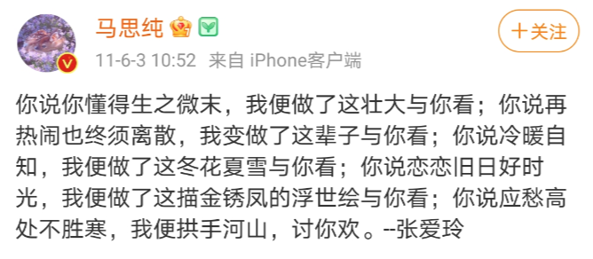 要她这样的经历和阅读经验的人去懂张爱玲确实有点力不从心,所以要演《第一炉香》她用假张爱玲语录事件已经是她身上挥之不去的标签,其实这毛病很多年之前就有了,2015年的时候,小马思纯就写出过山寨版的张爱玲语录。这些语录直到现在还有源源不断的网友过来考古,然后被人嘲笑。事实上,这也不能怪她,年轻女演员的文化水平都不高,周冬雨也不高,但人家不搞文艺这一套,也不说自己看书,但小马就是乐意发表自己的读书感受,因为她实打实的想要人家认为她是真正的文艺女青年。读书还不够,文艺的核心是疼痛,白富美的生活里“一切都好,只欠烦恼”,爱情于她,就是生活里最大事,于是她总是在渴望爱情,渴望婚姻,但身上始终都带着顾影自怜的、些许卑微的色彩。