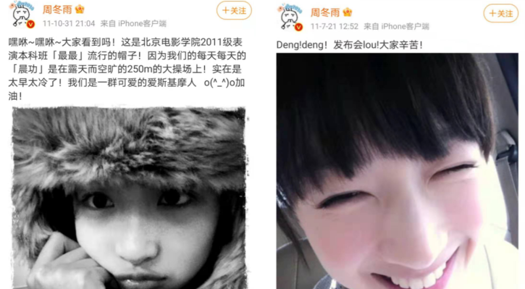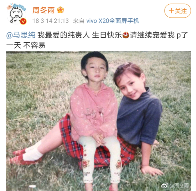 很微妙的是,马思纯在微博上叫杨紫“我的妹妹”,而就在五年前,这个称号还只专属于周冬雨一人。