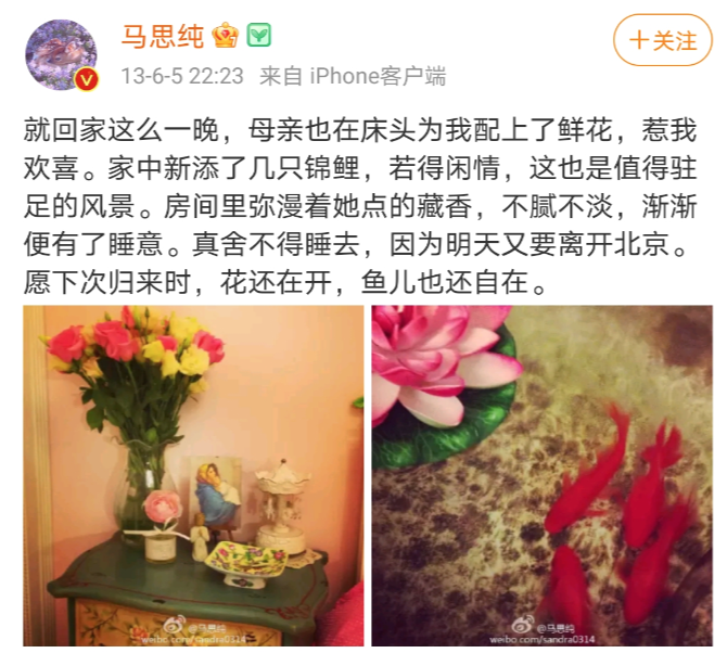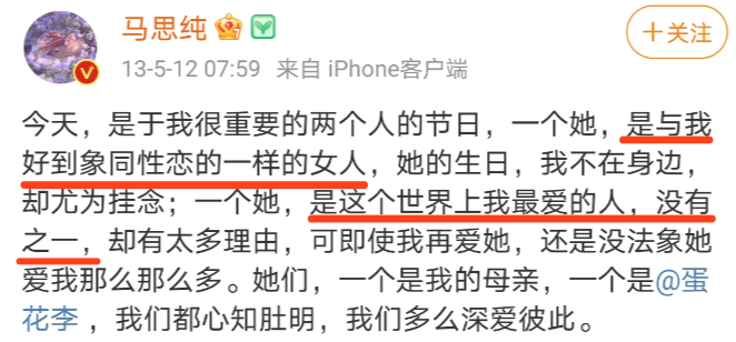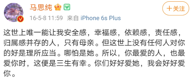 而马思纯和妈妈的感情非常深,无数次在微博表白妈妈是“我最爱的女人”。