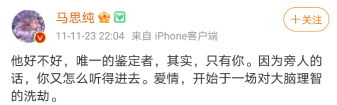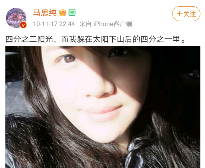 但一个成熟的人要通过谈恋爱才能亮起来,说明了两件事,第一她肯定特别想谈恋爱,第二她的自我在不恋爱的时候是匮乏和晦暗。女作家刘瑜有一句特别尖锐的话,人们之所以沉迷于恋爱这种激情的事件是因为它是一般人的避难所“爱情的伟大之处在于它可以遮蔽一个人存在的虚空,爱情的渺小之处在于它只能遮蔽这个虚空而已……”可以肯定地说,一个无法肯定自我,只能以人际关系界定的女人无论多么沉迷于谈恋爱,也是很典型的“边缘型人格障碍”。就在马思纯伤春悲秋为赋新词强说愁的时候,周冬雨展现出截然相反的风格,微博里各种小表情小符号,洋溢着少女的快乐。周冬雨的家庭条件当然比不上马思纯,她晒出的童年照透露出这就是一个普普通通的工薪家庭。