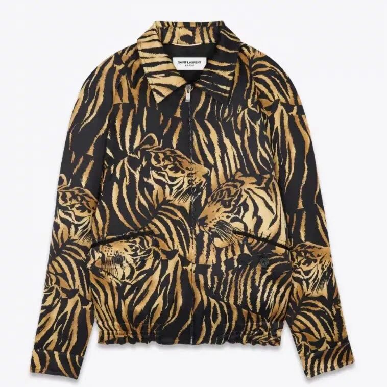 虎纹印花亚麻混纺拉链插肩夹克