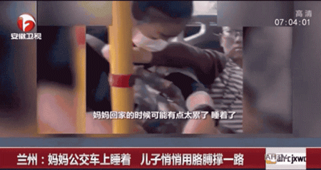 妈妈在公交车上睡着了,儿子悄悄用胳膊撑了一路。