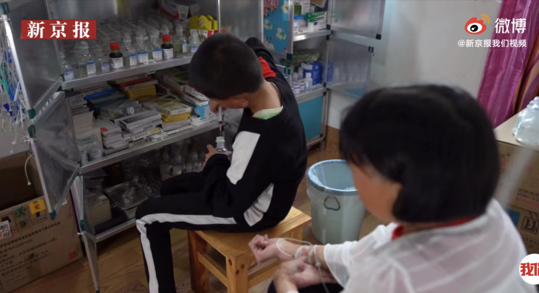 他用皮筋扎住妈妈的前臂,用手轻轻拍打,让皮肤下的血管显现出来,再用蘸了消毒液的棉签涂抹......在儿子的协助下,母亲张发翠用严重变形的手,完成了穿刺。