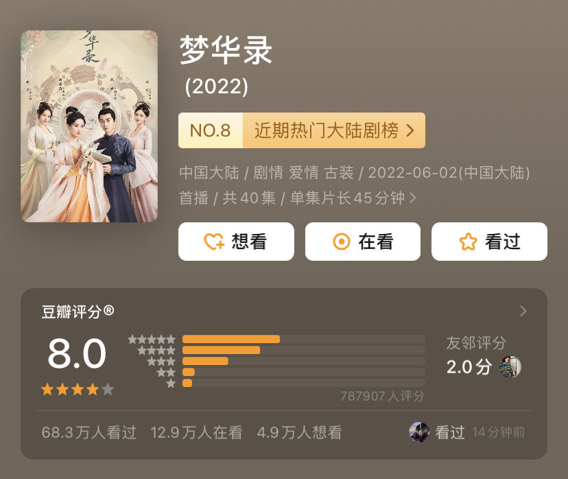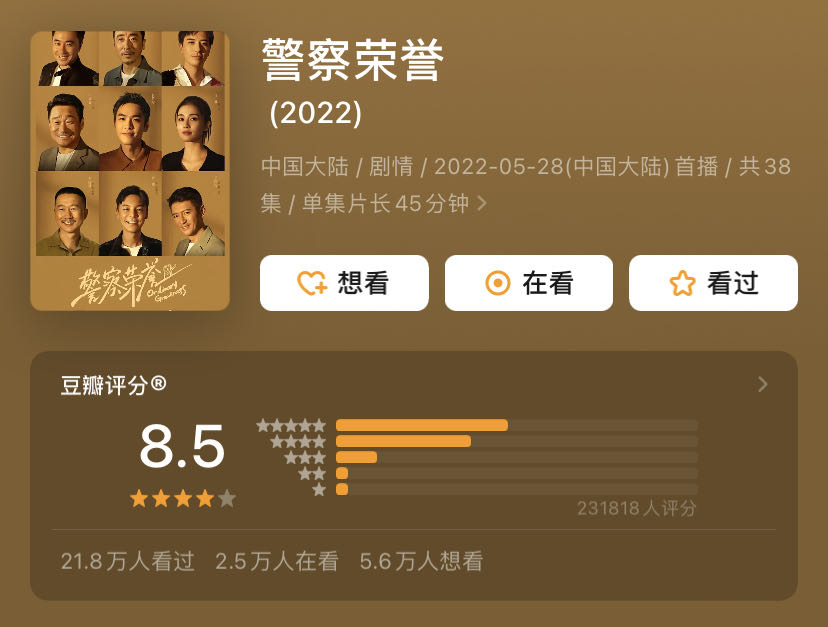 如果要把这一指标用数据具象化,目前国产剧能参考的平台不多,豆瓣评分或许可以作为其中之一。