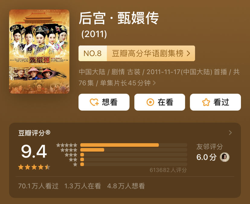 像无可争议的大爆剧《甄嬛传》,豆瓣评分有9.4分之高,这个得分也是70.1万人看过后打分的结果。