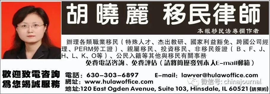 本文是胡晓丽移民律师为广大华人社区提供的移民法律资讯,并非对个案的法律意见。如有问题,可打电话 (630) 303-6897咨询,或发邮件到lawyer@hulawoffice.com 进行评估。本所办公地点在芝加哥西郊:120 East Ogden Avenue, Suite 103, Hinsdale, IL 60521,也可预约面谈。