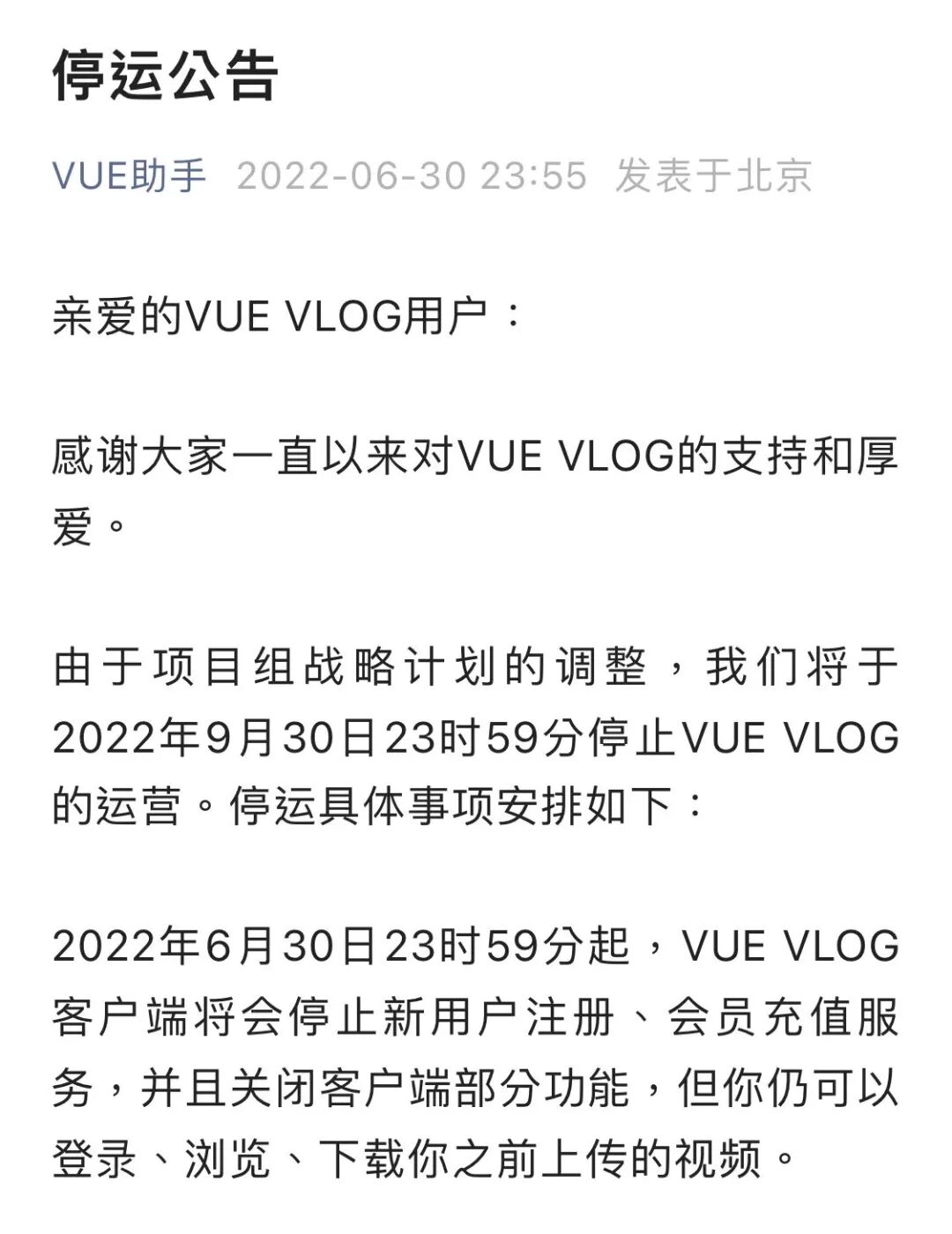 2022年9月30日23时59分起,VUE VLOG 将会全面停止运营,关闭服务器和官网。VUE VLOG提醒用户,请务必在 2022 年 9 月 30 日 23 时 59 分之前对需要保存的视频进行下载以防丢失,并对油钱进行提现、对未消耗完的金币进行退款。