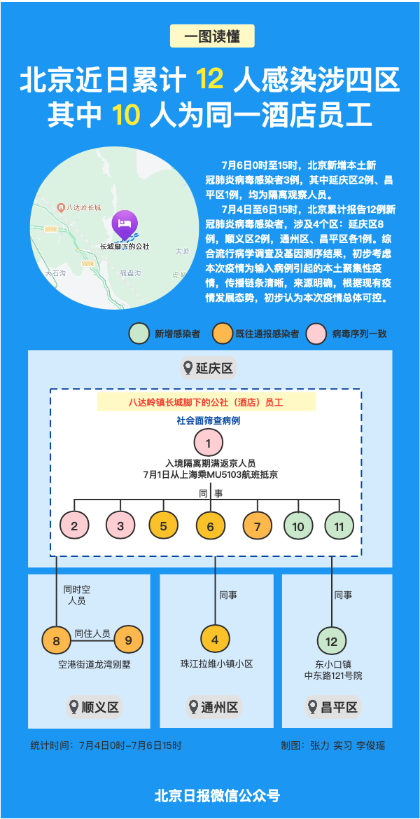7月4日至6日15时,北京累计报告12例新冠肺炎病毒感染者。涉及4个区,其中,延庆区8例,顺义区2例,通州区、昌平区各1例。