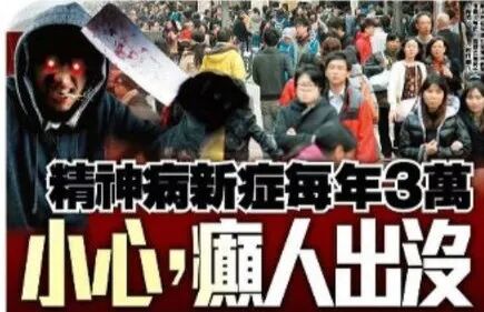 逐字分析,「癲人出沒」整個版面,取態遊走於兩極。它一方面用「隱形炸彈」、「失常狂徒」、「可怖」、「癲人」字眼來形容精神病者,加上目露凶光持刀狂人美術圖,效果是把精神病人「異類化」、「非人化」。
