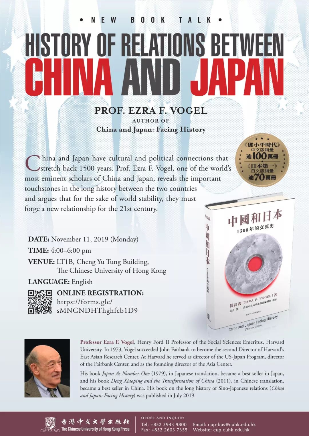 中國和日本在文化和政治上的密切連結可追溯至一千五百年前,中日研究權威傅高義教授(Prof. Ezra F. Vogel)將在講座中以歷史社會學的視角,討論中日關係史上的多個重要轉捩點,解構中日一千五百年的交流史。
