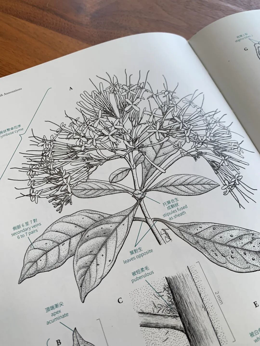 在墨線圖基礎之上,「植物繪圖圖解」部分也是本書特色:有別於一般植物誌往往是植物圖片和描述植物的文字分開排列,這本書在植物墨線圖的每個結構旁邊都配上了中英文描述,讓讀者能夠一目了然地看到植物的各種細節。這看似不難,其實需要對植物進行透徹的研究,才能做到每個細節和特徵都一一準確對應,毫不含糊。