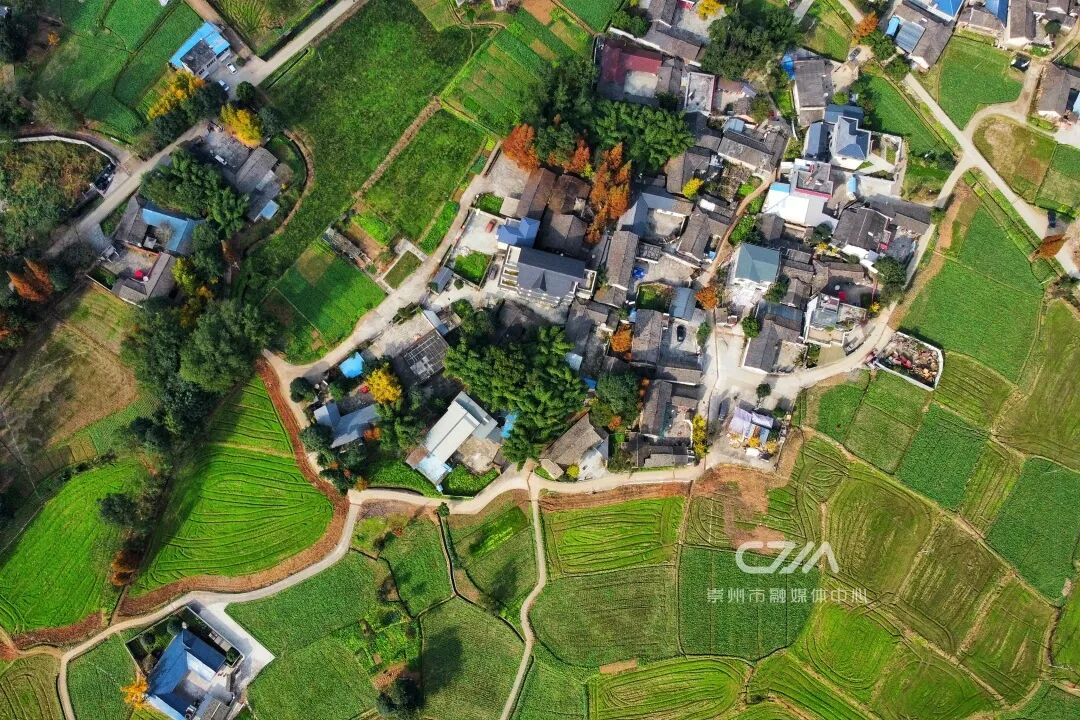 在广袤的田野上俯视村庄,