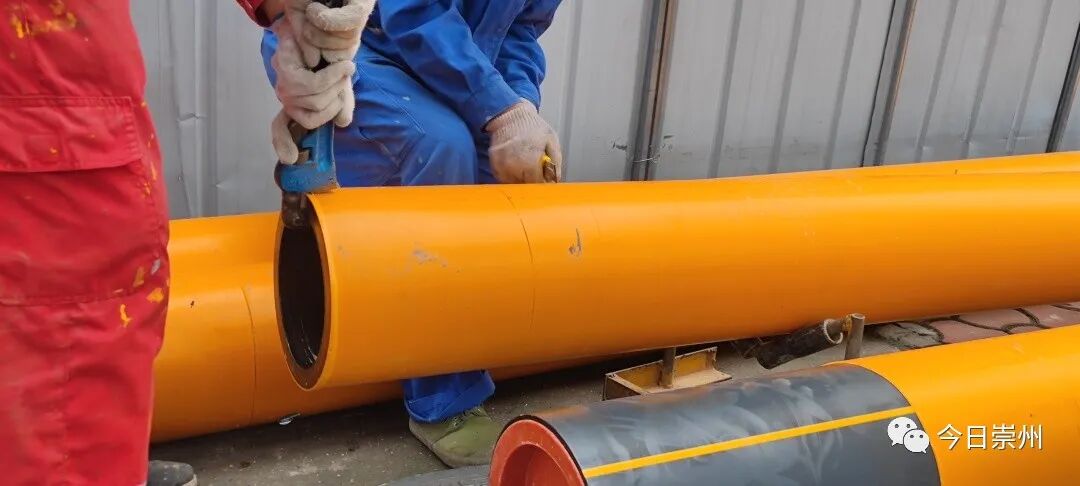 崇庆北路东侧施工现场,施工人员正在对已经预处理过的聚乙烯燃气专用管道进行管道链接操作。