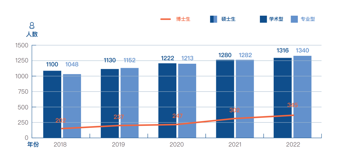 2018-2022年学校研究生招生人数逐年上升。2022年学校研究生硕博招生总人数突破3000人。