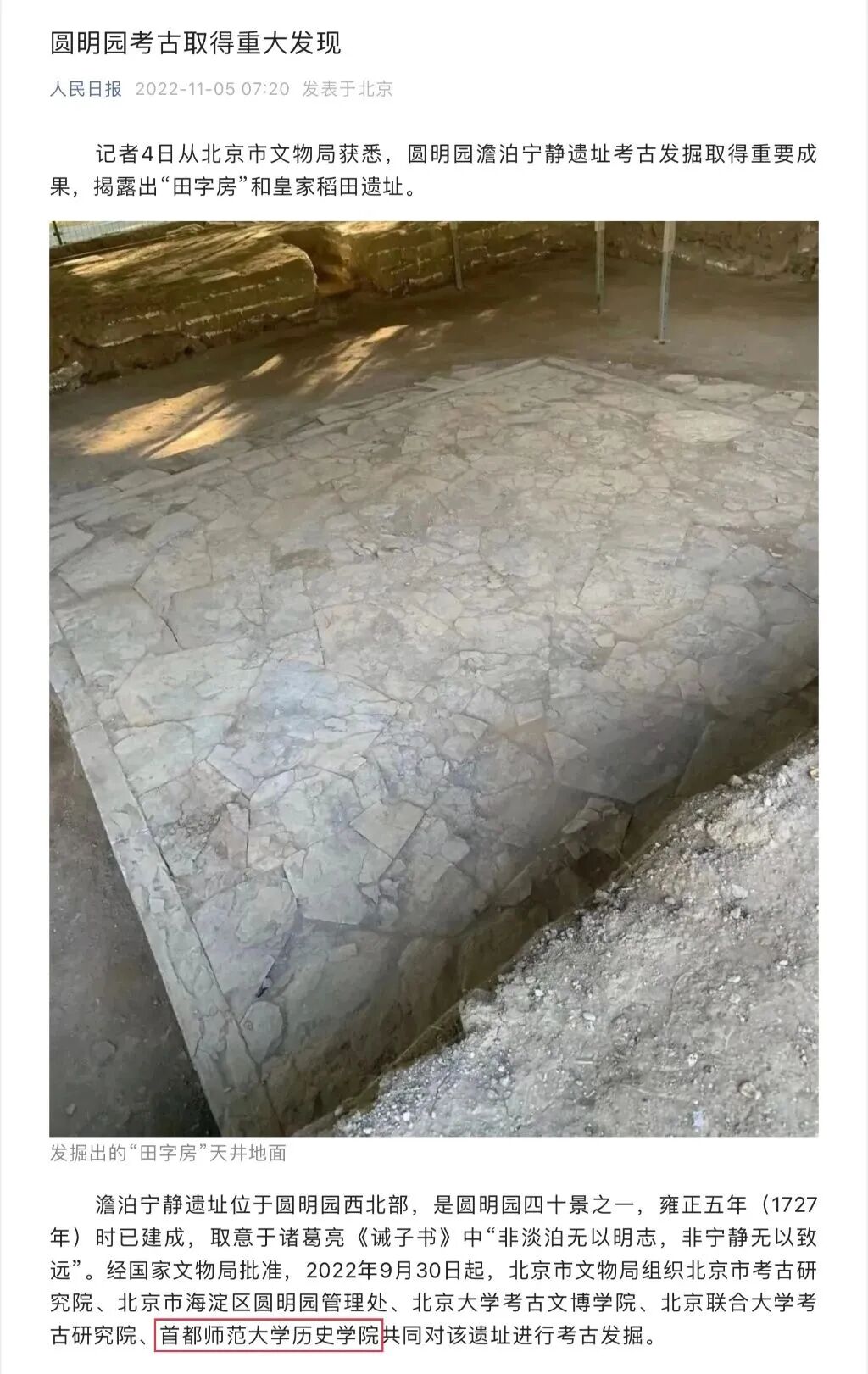 此次发掘工作经国家文物局批准,市文物局组织北京考古研究院、北京市海淀区圆明园管理处、首都师范大学等两所高校共同考古发掘,目前已取得重要成果,揭露出“田字房”和皇家稻田遗址。