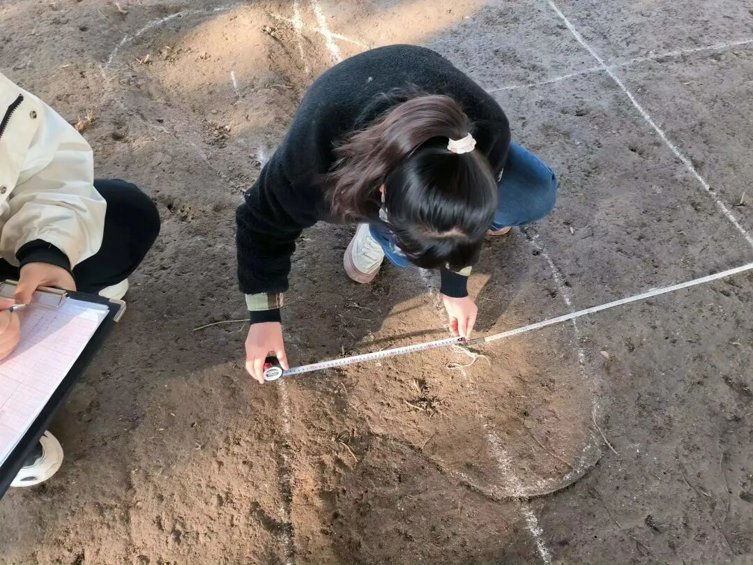 学生参与测量稻田遗址尺寸
