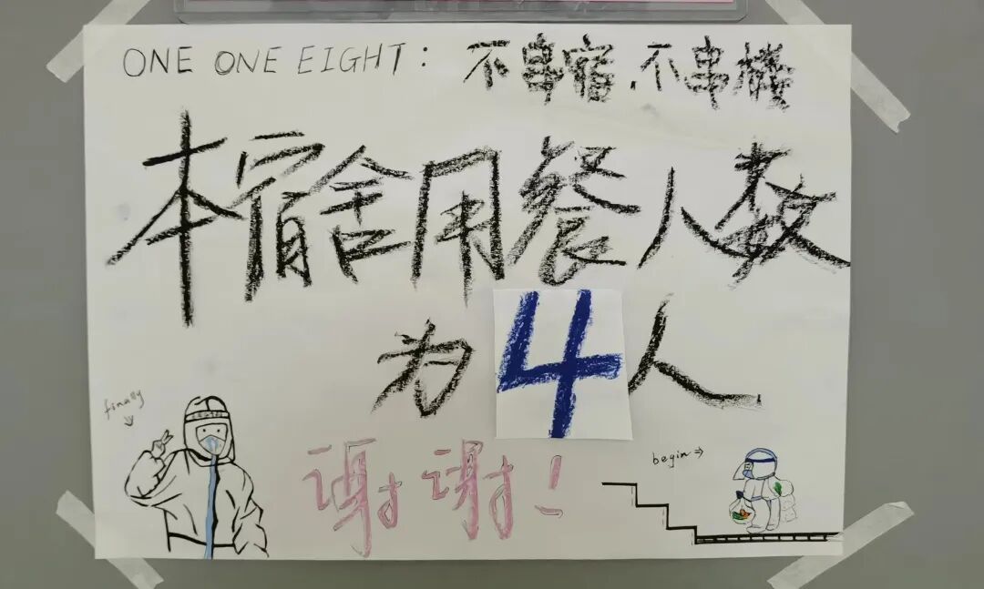 七楼的同学们在每天的核酸检测和餐食发放中都保持了高度的秩序性,并且遵守要求,不窜楼,不窜宿,每个宿舍在门都贴上了宿舍成员情况、抗疫温馨提示的标签,坚定了大家抗疫的决心,非常感激同学们这段时间的配合,也更感激志愿者及老师们的辛苦付出。