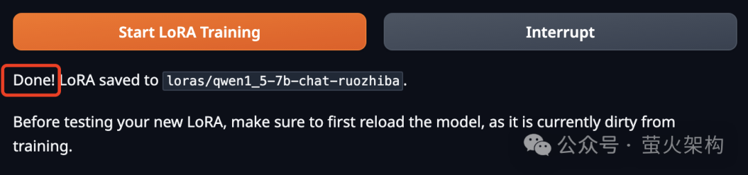 训练完成后,这里会显示“Done”。注意这里有个问题:如果WebUI和服务器断开了网络连接,这里就不更新进度了,此时可以去 AutoDL的 jupyterlab 或者你的命令界面中查看训练进度。