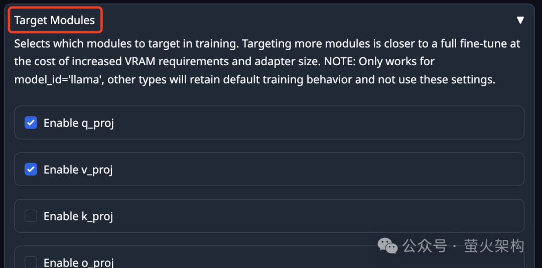 这个参数仅针对 llama 类型的模型结构,默认勾选的是 q_proj 和 v_proj,具体的名词不容易理解,我就不多说了,可以简单的认为是对模型的理解能力进行优化,一般这两个就够了。当然我们可以勾选更多的项目,优化模型的生成效果。但是可能会导致两个问题,一是训练要使用更多的资源,更慢;二是可能导致过拟合问题,也就是只在训练的数据上表现的好,面对新问题就不灵了。Qwen1.5-7B的模型结构也是llama类型的。