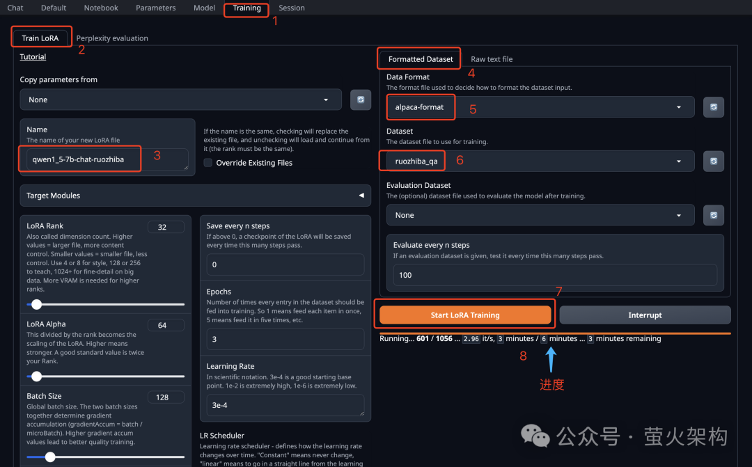 我们先来快速的过一遍训练过程,请按照下边的步骤开启LoRA训练: