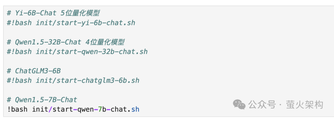程序默认加载的是阿里开源的 Qwen1.5-7B-Chat 模型,你也可以更换别的模型,只需要去掉命令前边的“#”,注意同时只能加载一个模型,其它模型不使用时,请使用“#”注释掉。