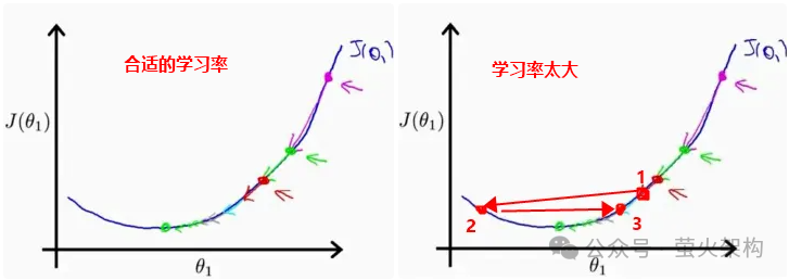 学习率。机器学习在训练过程中会不断检查自己与训练数据的偏离程度,它有个名词叫损失(loss),一个合适的学习率会让损失逐渐收敛在一个最小值。如果学习率太大,步子就会迈的太大,不能获取较好的效果;但是如果学习率太小,又会训练的很慢,成本太高。如下图所示: