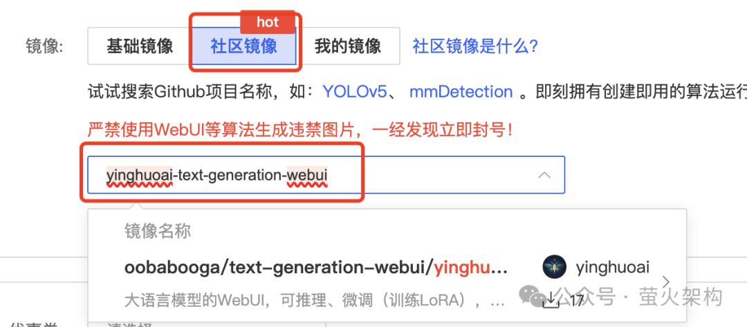 3、镜像:选择“社区镜像”,输入 yinghuoai-text-generation-webui ,即可选择到我分享的镜像。