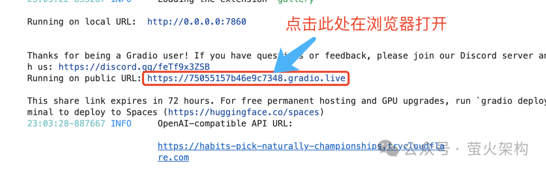 6、在下方的日志中看到类似输出的时候,就代表启动成功了。其中的 https://xxx.gradio.live 就是WebUI的链接,点击就可以在浏览器打开它的使用界面。