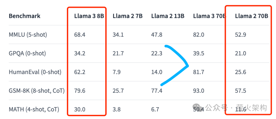 Llama3经过指令调优的模型在常见行业基准测试中,性能超越了许多现有的开源聊天模型。8B参数的性能甚至大幅超越了之前的Llama2-70B的性能,革了自己的命。