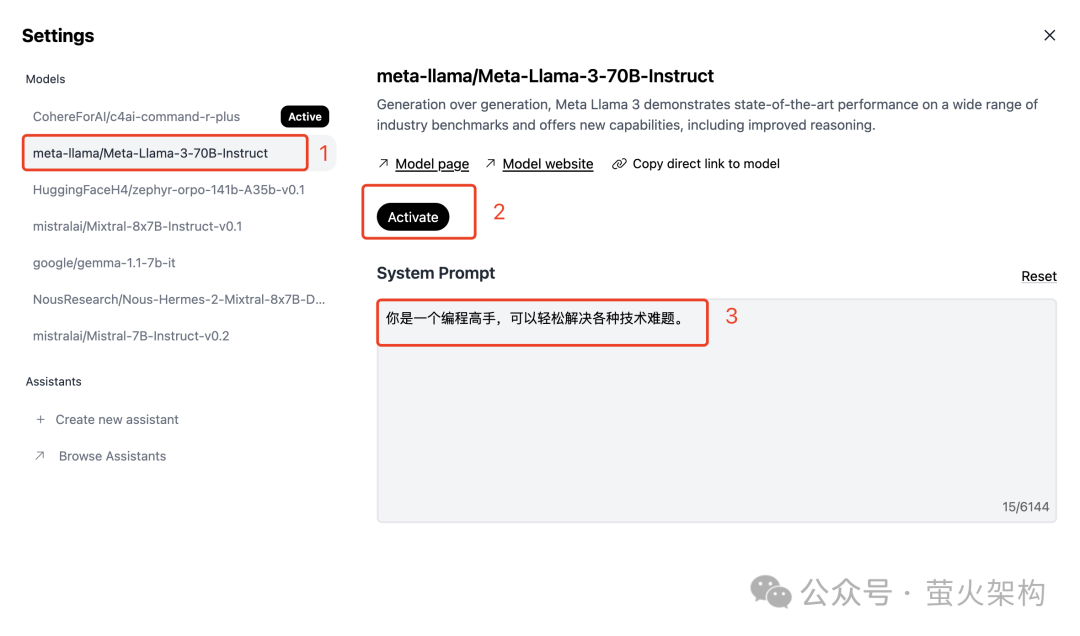 左侧选择模型,点击 Activate 激活模型,填写AI角色定义。