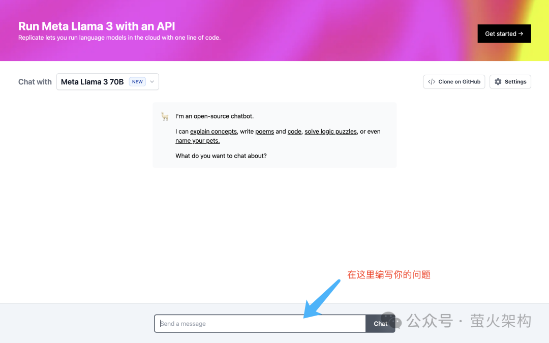 然后就可以和Llama3愉快的聊天了,不过Llama3的中文能力不太行,虽然看懂了中文,但是使用了英文来回答问题(即使我们要求它使用中文,也可能会随时输出英文),这还需要国内的企业或者社区再努力奋战若干天。