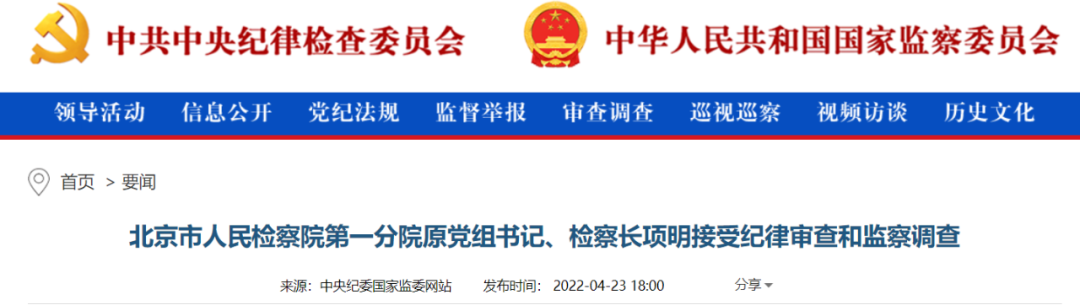 据中央纪委国家监委网站4月23日消息,北京市人民检察院第一分院原党组书记、检察长项明涉嫌严重违纪违法,目前正接受纪律审查和监察调查。