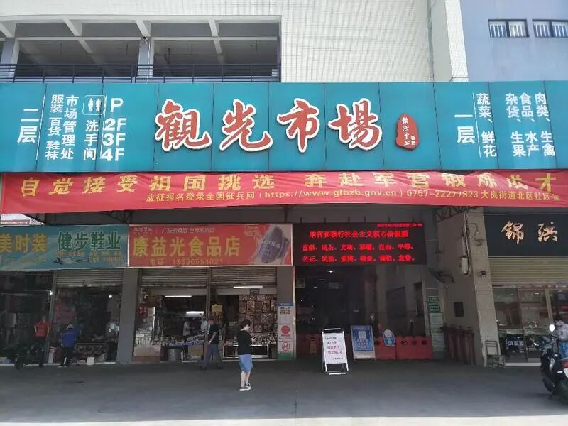 大良观光市场占地面积约1.2万平方米,市场布局合理,通透明亮,按经营项目划分为三个区域:生果副食区,蔬菜鲜花区,水产肉制品区。大良观光市场以农产品种类齐全、物美价廉而闻名顺德,吸引了大量的居民购物消费。