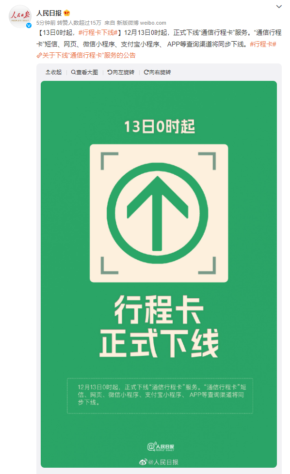 「通信行程カード」のサービスの提供が12月13日0時に終了する。ショートメッセージ、ウェブサイト、微信ミニプログラム、アリペイミニプログラム、アプリストアから一斉に撤去が行われる見通しだ。
