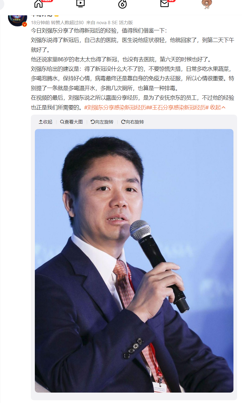 京東集団董事長の劉強東氏は昨今、医師から感染を告げられて在宅治療に入ったが、翌日午後には症状が恢復したことを明かした。さらに86歳の高齢者でさえ、通院することなく6日目に治療を終えたと紹介。病院という限られた資源は、治療を本当に必要とする高齢者に提供するようにと訴えた。