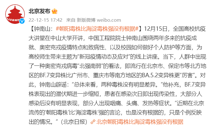 鐘氏は講義のなかで、オミクロン変異株の毒性が地域によって異なり、「北強南弱」(北方地域で強く、南方地域で弱い)の様相を示しているとする認識が広がったことについて、これをデマだと一蹴した。北京や保定(河北省)など北部で流行しているBF.7(BA.5.2.1.7の略)ウイルスは、重慶などで広がったBA.5.2の変異株であり、全体として2つの系統のウイルスの間には際立った差が見られないとしている。