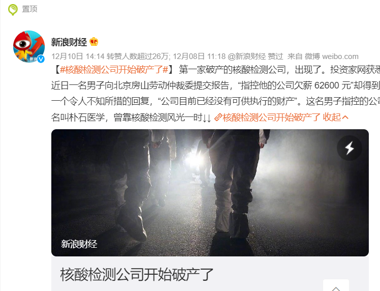 核酸检测公司破产:6万元的欠薪也付不起