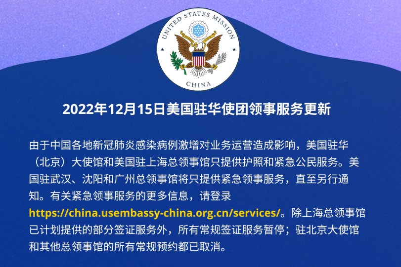 在中国米国大使館は15日、🔗微信公衆号で、上海総領事館で受け付けた部分的な業務をのぞき、通常のビザ発給業務を一時停止すると発表した。北京の大使館および他都市(広州、武漢、瀋陽)の総領事館における通常業務もすべて取りやめとなっている。