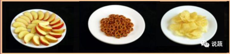 200千卡的零食案例,苹果,土豆片和饼干的体积比较