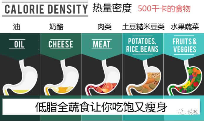 作为饮食结构,低脂全蔬食的CD值很低。大量低热量密度值食材作为基础,豆类,全谷物,蔬菜和水果。高热量密度值的食材如坚果和种子,牛油果和豆干,通过控制比例来实现平衡,这是食材选择的组合规则。坚果和种子限量使用,不要做零食,坚果和种子作为辅料,比如沙拉酱和甜点。采用低油最好无油的料理方式(炖、蒸、煮、拌,生食),因为深度加工(炸、煎、爆炒)会让食物组合的热量密度迅速增加。
