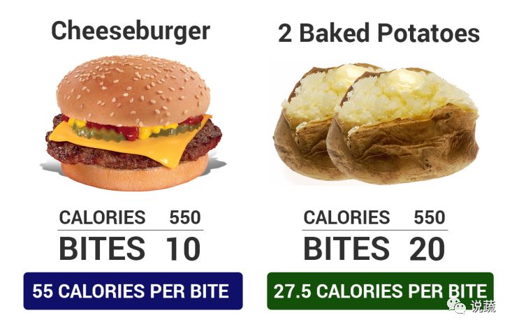 图中有个概念叫每口卡路里(CPB:Calorie per bite),汉堡和土豆的CPB分别为55kcal 和27.5kcal 。男性一顿饭热量需求800kcal 左右,汉堡哥只能吃14.5口,土豆哥29口。天呀,才14.5口?要么再来一个,要么每口咀嚼20次以上,否则汉堡哥一定觉得没吃够。