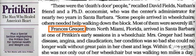 住在佛罗里达州北迈阿密的弗朗西丝·格雷格(Frances Greger),坐着轮椅来到圣塔芭芭拉,加入了普里特金的其中一个早期疗程。格雷格女士患有心脏病、心绞痛,双脚不良于行;她的情况很糟糕,每次勉强走路时,都必须忍受胸部和腿部的剧烈疼痛。然而,治疗不到3周后,她不仅不需要坐轮椅,还能每天步行10英里(1英里≈1.6千米)。