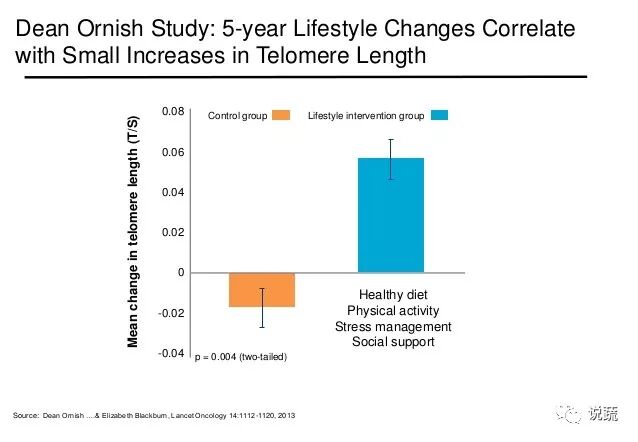 那么,两位医生的研究是否证明了健康的饮食和生活就能延缓衰老呢?一项为期5年的后续研究记录了受试者的端粒长度,该研究已在近期发表。 控制组的参与者不改变生活方式,他们的端粒长度随着年龄增长而缩短。