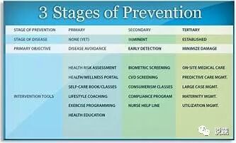 公共卫生学院教给学生三级预防医学。一级预防力图防备第一次心脏病发 作的到来。举例来说,医生开降胆固醇的他汀类药物。二级预防是针对已经患 病的病人,意在阻止病情发展,比如扼杀第二次心脏病发作。医生此时可能会 增开阿司匹林等药物。三级预防则针对长期的健康问题,医生或许会实施心脏 康复计划,阻止病情发展或疼痛出现。2000年提出四级预防,旨在缓解前三级药物或手术引发的并发症。 人们似乎忘记了第五个概念,即“初级预防”。它 于1978年由世界卫生组织提出。几十年后,这一概念才被美国心脏协会认可。